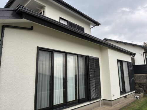 白壁の塀瓦が立派な日本家屋の外壁、木部の塗装工事を行わせていただきました。見た目の印象は大きく変更せずに住宅の保護のための塗装を行っています。職人の技が感じられる木組みが特徴的な出窓部分は、木材の保護のため耐久性に優れた塗料を使用して塗装を行いました。また、玄関の庇には、立派な無垢材の玄関柱がありましたので、元々あった木材の風合いは保ちつつ塗装により美観を整えさせることができました。